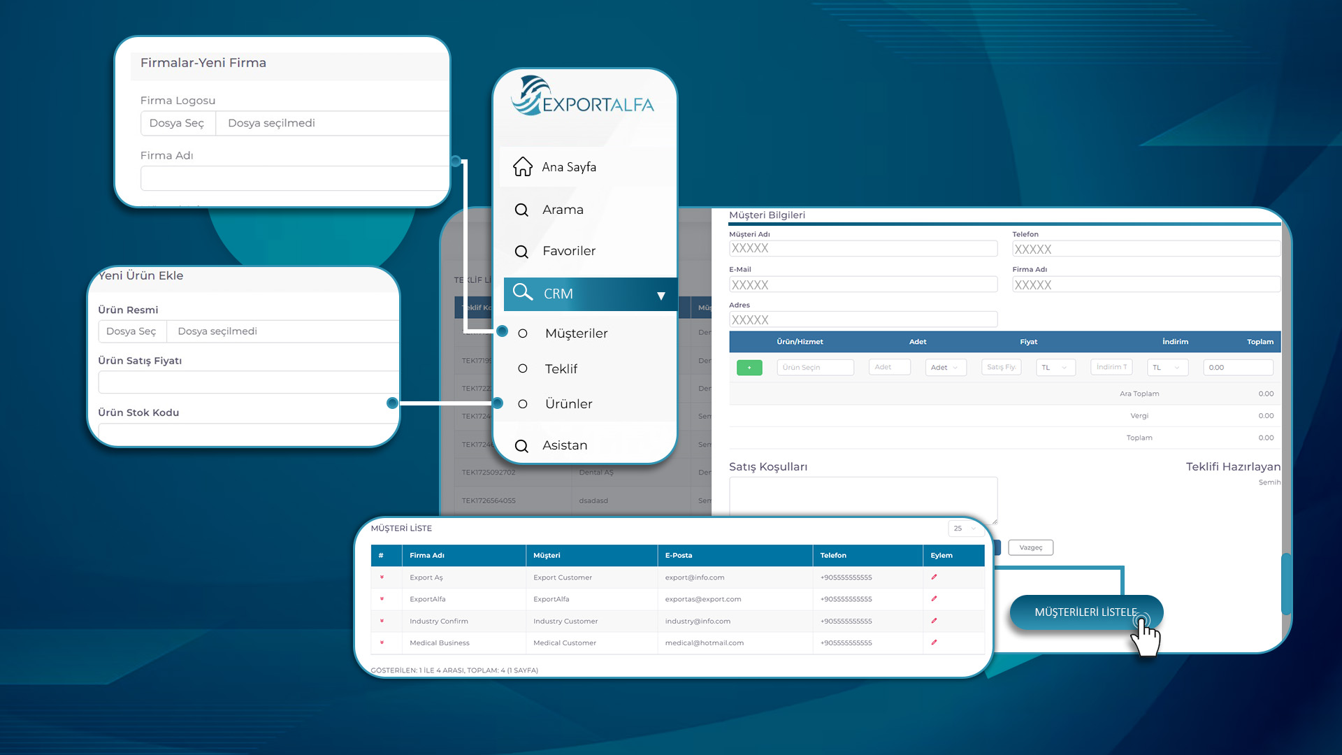 Exportalfa CRM (Müşteri İlişkileri Yönetimi) yazılımı, işletmenizin müşteri ilişkilerini yönetmenize ve geliştirmesine yardımcı olan güçlü bir araçtır. CRM yazılımımız, satış, pazarlama ve müşteri hizmetleri süreçlerinizi entegre ederek daha etkin bir müşteri yönetimi sağlar.